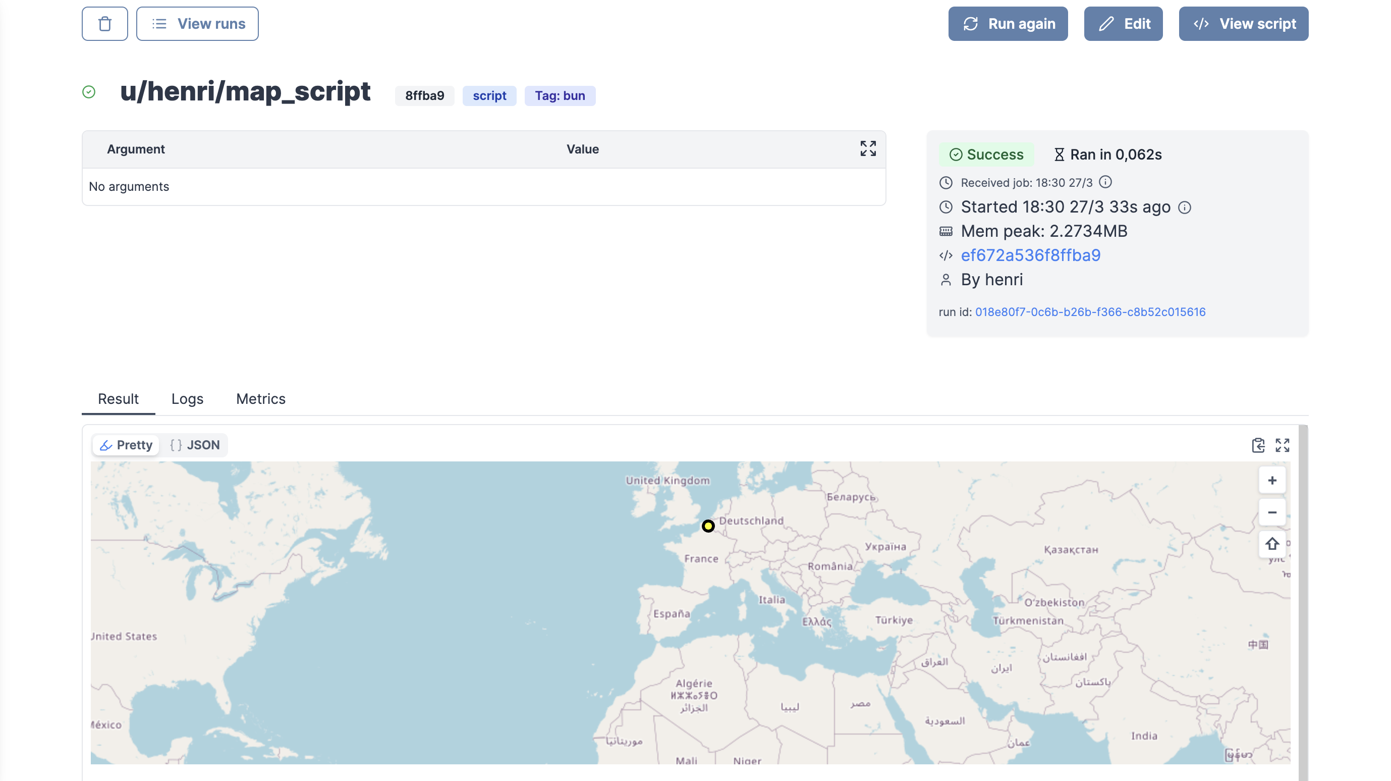 • Example: `return { "map": { lat: 40, lon: 0, zoom: 3, markers: [{lat: 50.6, lon: 3.1, title: "Home", radius: 5, color: "yellow", strokeWidth: 3, strokeColor: "Black"}]}`
